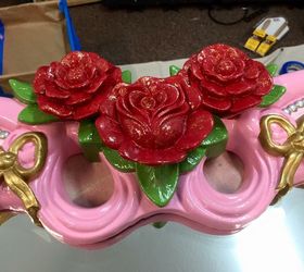 Sand the entire furniture. Then I painted the dark pink over virtually the entire piece, then started adding in the details. Purple next, followed by the silver dots, and gold trim (all hand painted). Next is the crackle finish on the top. The last detail is to tape off the top area so I can spray on the gold edge (as it is too large and detailed to hand paint...plus it is quicker to tape it and spray it). Final step is to apply three coats of your chosen clear coat.