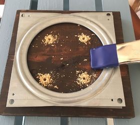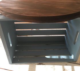 I started this project so long ago, I can't find the beginning pictures. Basically, there were two pictures of 5 painted wood crates and a picture of the lazy susan mechanism before it was attached to anything. The above picture is where the problems began. To make the lazy susan base of my project, I bought two circular-shaped glue edge boards from Home Depot. I began staining them on my deck. One was stained and then I was interrupted before I started the second. I completely forgot them on the deck until the next morning. Of course, it rained during the night. The one that was stained faired "ok" but this one did not. I was determined not to go buy another one and this wasn't going to glue back together perfectly. "Stay on budget" is my mantra. So, I changed the plans from two circles on my lazy susan to one circle as the base and a small square wood top.