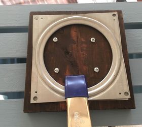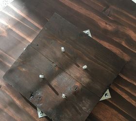 To quickly find the center, I traced the shape onto kraft paper. I folded it into quarters which marked the center. I put the kraft paper on top of the wood circle. I lined up the metal corners with the folds on my kraft paper. I marked each hole by pressing a nail through the paper and making a mark on the wood. This would show me where to attach my screws so that the mechanism would be located in the middle of the base/wood circle.