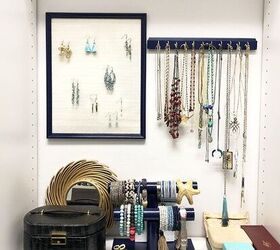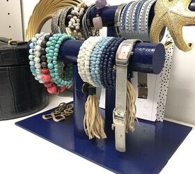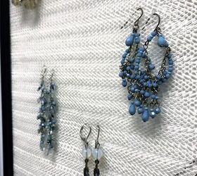 not a question, I used an old cake rack for my dangle earrings and hung on the wall. And cup hooks on a pine board for my necklaces and bracelets.