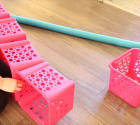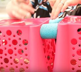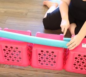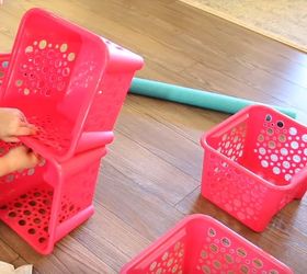Once all your baskets are connected,place your shelf on the floor upside down. You will need to add "spacers" to the back of your shelf to ensure that it will stand up by itself. A pool noodle worked perfectly for this! You can cut your pool noodle to size with a regular kitchen knife.