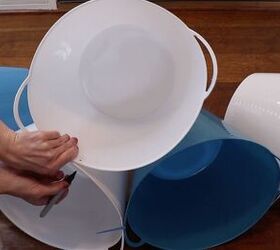 Once I had four buckets secured together for the base I created a second layer. I needed three more buckets for this layer and a wood-burning tool.