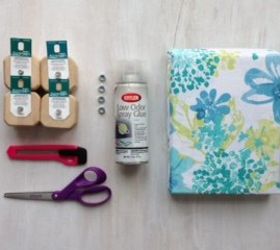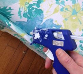 Fold under any raw edges of your fabric pieces. Using your hot glue gun, adhere the folded edge to the bin. Continue tucking and gluing all four sides of your bin, as well as the bottom and the bin lid. This makes your bin look much cleaner.