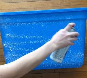 Using your spray adhesive, spray the glue on one side of the bin. Let it dry until it's tacky and clear. Only spray one side at a time.