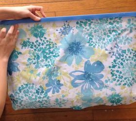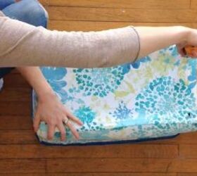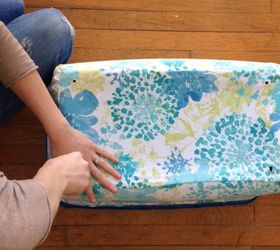 Apply the first fabric piece onto your tacky glued surface. Smooth out any bumps and lumps and follow the edges of the bin.