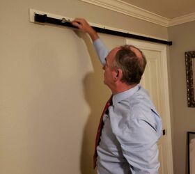 The first thing we did was to set up the header board above the door frame. I used a 1x4 pine board, cut it to the length of the track and then painted it white. Using a stud finder and lag bolts, I pre-drilled into the header board and stud, using a socket wrench to screw in the lag bolts.