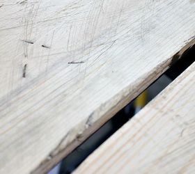 First I distressed the boards. I used nails, planers, a hammer, chain, my anger and frustrations – whatever I could to ding up the boards to make them look old and beat up. There’s no rhyme or reason to it, and you can’t mess it up – just whack away at those boards to add the weathered look.
