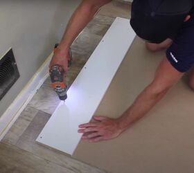 With the top board in place, I moved on to the side. I took one of the 1”x4” x65 ½” MDF boards and glued it flush down the side of the MDF sheet. Then I secured it with trim head screws.
