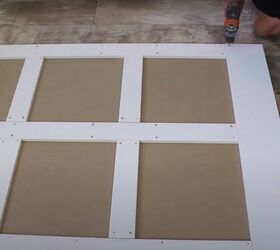 With one side of the board done, I started on the other side. First I attached one of the 1”x4” x65 ½” MDF boards down the center. Make sure that it’s flush against the boards that we just attached. Then I repeated the whole process again on the second side of the board.