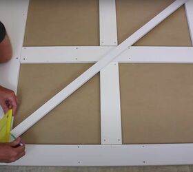 Remember those two 1”x2” x8ft MDF boards we put aside at the beginning? Now we get to use them! I lay one of them across one of the squares on my newly created door. I made sure that one of the edges lined up with the corners of the square, and using a straight edge I marked where I needed to cut.