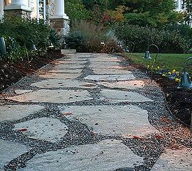 We modified the existing walkway, which was only a single slab wide. Pea gravel was used in the joints, and the walkway was lit with path lights from Focus Industries. Delaware County, PA