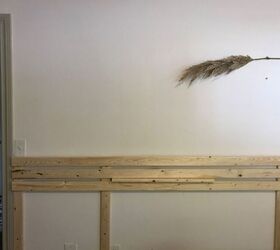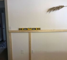 To start the horizontal boards, we decided to use wood glue and brad nails to hang each board. So, we put the first board up, checked that it was level and then used 2 brad nails into each board that was screwed into the wall.