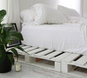 Do you have a look in mind for your finished pallet bed frame? Hometalker Leila Farmer came up with a clever design by making the base a little bit bigger than the bed, so she could decorate around it. She used several pallets for the base and also placed the box spring under the mattress, to give a higher bed than would have otherwise been the case. Get tutorial here