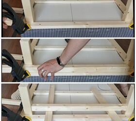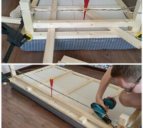 Now i fixed legs to the sofa base. I fixed them with clamps. To connect legs between them together, i used pine boards 35*35mm. I fixed them with pocket holes and some glue.