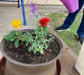 Step 6: Before planting the flowers, I moistened the soil with water. Then we planted the flowers.