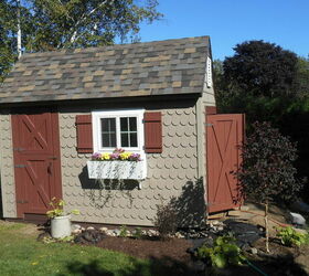 Hometalker Delusions of Ingenuity was not new to shed building, but this latest project had strings attached. The deeds of their latest property stipulated that any external buildings should be built using the same materials used on their house. After hiring someone to pour the concrete foundation, her husband framed and built the rest of this cute shed. The gray shake siding was also used on the front of the shed to create a stylish, consistent appearance. Get tutorial here
