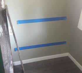 I marked the wall with tape to mark where I wanted to put my shelves . I knew that I wanted a little more space between the bottoms shelves to allow room for taller containers .