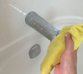 After the two hours are up go back in and wipe the tub down with the microfiber cloth. I know I said no scrubbing, but this is just a wipe down to loosen everything up, you don’t need much effort. I then like to rinse everything off with hot water. You can see how shiny and clean the chrome fixtures are now.