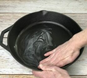 Spread coconut oil all over the inside of a cast iron pan. Place it in the oven on 350 and bake for 30 minutes. Pull out and let cool and your pan is seasoned.