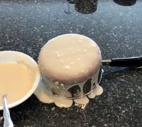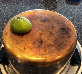 Lemon Juice & Salt Paste - I poured about 1 Tablespoon into a bowl, added salt and mixed until I created a paste. I used a scrub pad to scoop up the mixture and made circular motions on the bottom of the pan.