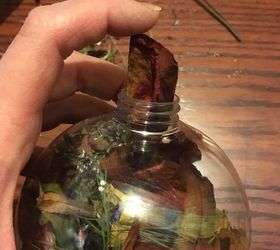 First I put in the leaves and petals which I found were perfectly fine if I rolled them just enough to fit in the opening. They unrolled inside automatically. I filled the bulbs fairly full and then went back and put in more petals because dad got a lot of flowers.