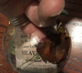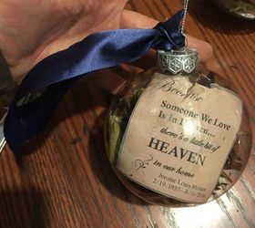 Here’s the finished ornament. I've listed a couple links where I found this idea. As I said, “Not my idea at all.” I just wanted people to know how I made it work and I find this to be a much better memorial than a $100 candle. All it took was a little time and less than $30.