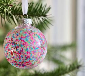 Next, Mary Jane Duford of Home for the Harvest shares how to transform old crayon shavings into Christmas tree decorations by filling clear round ornaments.