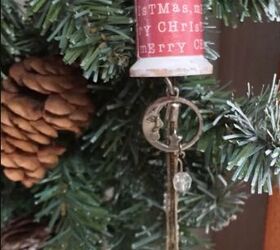 Adding scrap jewelry for bling, she repurposed a beaded ornament hanger by straightening it and threading the spool and jewelry through. With a bit of creativity, these ornaments became delightful gifts or decor pieces, proving that a simple wood spool can become anything from a holiday ornament to a fan pull or even a necklace.