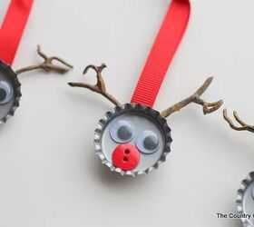 In this adorable DIY project, Angie CountryChicCottage shares how to make reindeer bottle cap ornaments. Secure googly eyes and buttons inside the inverted bottle cap, then fasten red string and branches to create charming horn decorations.
