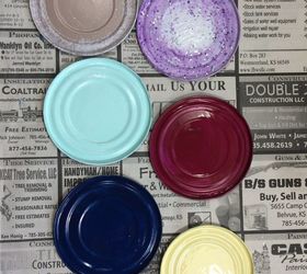 Cut the lids off the tin cans with a Safety Can Opener so there are no sharp edges. Paint the lids different colors; if needed, paint on a second coat of paint. Accent them by stenciling a coordinating color around the outer part of the lid or all over.