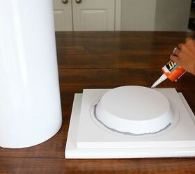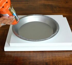 Use Liquid Nails (Construction Adhesive) to glue together the base of your pillar. Place your 11x 14 at the bottom, add glue to the back of your 10 1/2 X 12, and center over your 11 X 14. Lastly, you're going to center your pie pan over your 10 1/2 X 12.
