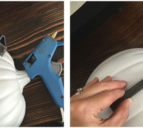 Okay, so I hope this doesn't confuse anyone, but stick with me here as I try and explain this... For starters, when I did this project, I made the mistake of painting my pumpkins first. DON'T DO THAT! The adhesive will rub the paint off and it'll be messy, so paint them AFTER you attach them.
