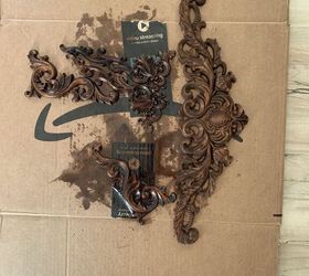 For the stain I chose to use my favorite staining method, mixing my stain with satin sheen polycrylic. Mixing the two creates a beautiful, splotch-free, professional finish. You can read all about that method in this post. I ended up doing three coats of stain to get the look I wanted. I also used the same stain and method to stain wooden appliqués. I got the appliqués from Amazon, although you can find some pretty ones at places like Lowes and Home Depot, or Michaels and Hobby Lobby. These are the ones I ended up using here, here and here.