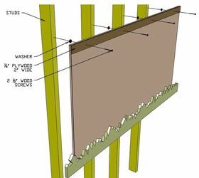 Now it’s time to attach the backboard to the wall. First, take a Level and draw 66" horizontal line on the wall. The line will indicate where the top of the backboard will be attached. Next, using Stud Finder, locate and mark the studs right above the horizontal line. Then, similar to step 4, cut a 58" long 2" wide strip of 1/4" plywood. Before attaching the backboard to the wall, place a Washer in the back of the plywood. This will make a small gap between the plywood and sheetrock for a metal angle to slide in, see step 6. Use 2 1/2" Wood Screws to attach backboard to the wall. Make sure you hit the studs. The mirror is very heavy and need to be attached to studs not just sheetrock.
