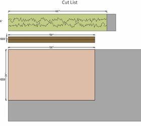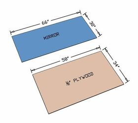 Depending on your mirror size these dimensions might be different for you. In this case, I'm using 66" x 30" mirror, so all of the dimensions are based from the overall mirror size. The first step is to cut 1/2" backboard plywood that would be attached behind the mirror. The plywood needs to be 4" taller than the mirror and 8" shorter in length than the mirror. The total dimensions of the plywood is 58" x 34"