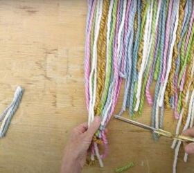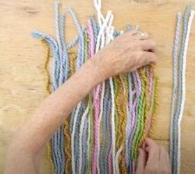 Next, I took some colorful yarn and cut it into 2 foot lengths. You don't want it to be perfectly two feet, it's okay to aim for imperfection as it adds to the carefree spirit of the boho aesthetic. So, make your bottom pieces varying lengths for a more authentic-looking boho wall decor.
