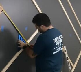 We used 1"x2" furring strips. We measured the length of the wall where we wanted to place the first piece of wood. I recommend doing your longest lines first. Cut both ends of the wood at a 45 degree angle for the first board. Attach to the wall using a brad nailer/ nail gun. Try to nail the wood in line with where you marked the studs in the wall. This will ensure the boards are nice and secure to the wall.
