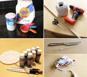 You could of course simply tie the string around the dowel which would give you the ability to slide the salt dough shapes to the left or right once they hang on the wall. This way you can easily rectify a mistake if one is made. You would also not need a drill.