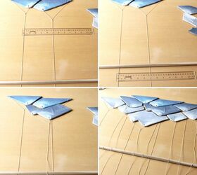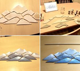 Now, lay your shapes out as you want them to appear on the wall and then lay your wooden dowel down parallel to the top of your mountain scene but leaving a small gap of roughly 3 inches. Then gently pull all the pieces of string straight up and rest them on the wooden dowel. Take care not to move your pieces out of their over all shape when doing this.