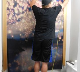 My main floor bathroom has been left out compared to the rest of the house! It has no theme and a bunch of random decor gets thrown into it. Sad. Here my husband is measuring the wall so I know what dimensions I'm working with and how big of an image I can fit on the wall.