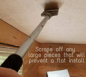 Start by scraping any large texture pieces or chunks with a putty knife or my favorite a floor scraper. Knock anything off that would prevent a flat install.