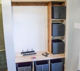 For the side storage, I anchored 1x2 cleats to the studs, then added 1x12 shelves. I placed small and large storage bins from IKEA onto the shelves and floor.