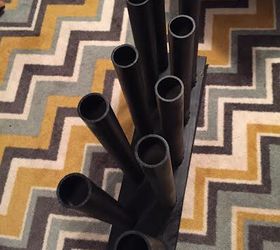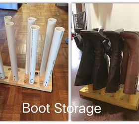 This was a prototype that my hubby and I came up with to store my boots. It is not pretty but does the trick! Made with things we already had around the workshop: 2" diameter PVC pipes, dowel rod (cut in 4" pieces for support under the PVC rods), heavy block wood scraps and a piece of carpet on the bottom (optional) for it to slide in my closet.