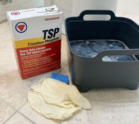 Start with a super clean slate. TSP is a great heavy duty cleaner for tile and helps remove all wax, dirt and grime. Add a couple TB to warm water and apply with a sponge. Once the floor was dry, I applied painters tape around the edges of the toilet and tub. We are replacing our baseboards, but if you are not be sure to tape off the walls too!