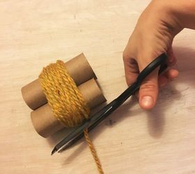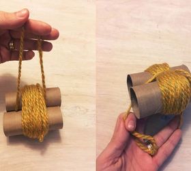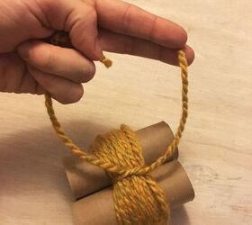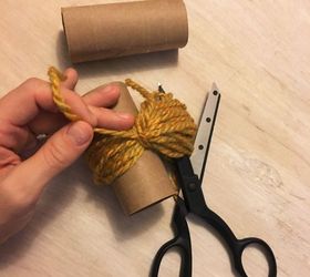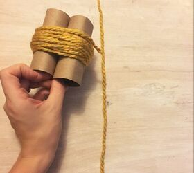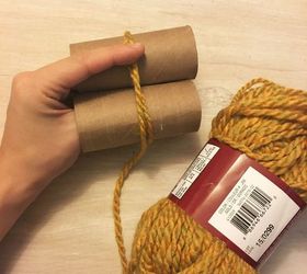 Take your yarn strand and feed it between the two rolls of toilet paper, then wrap it tightly around the bundle of yarn.