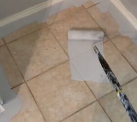 Next, apply the base coat. This product provides 1 coat coverage and I was skeptical but impressed! It really did only take one coat and applied beautifully. I rolled the tile but used a brush to cut in around my cabinets and baseboards. This coat dries in about 6 hours.