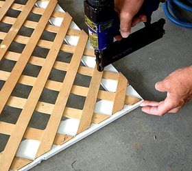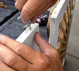 Paul took a break while I painted all the boards with a couple coats of white exterior paint. I made sure to paint the ends of the boards since some of the ends would be exposed. I wanted to sandwich the lattice between two frames, but we were out of lumber, so I agreed to seeing how it looked with the frame on just one side. If it looked tacky like that, we'd add a frame to the back.