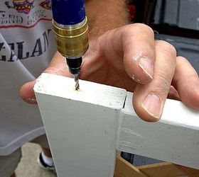 Next, we hauled the panels to the patio (notice that I said we?), and drilled starter holes in the center of both end boards on each panel.