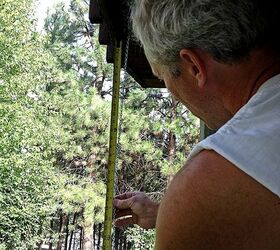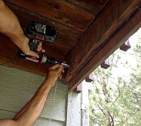 I wanted the panels to be placed at a height that provided privacy both when we were sitting or standing. Paul held up a panel while I eyeballed the height (very high-tech precise measuring system, yes?). Then we measured and marked to be sure the three panels were evenly spaced across. Starting at one end, Paul slipped the drill bit through the chain , attached a screw to the drill bit (I love that they’re magnetic), and drilled the screw at his first mark. We used 10 lb capacity chain (that I was certain wasn’t strong enough to hold the panels).