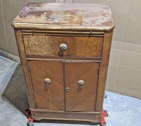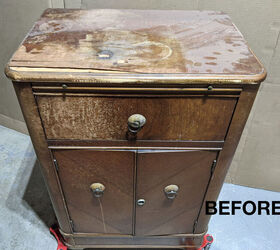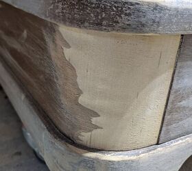 The top was in really rough shape with badly cracked veneer. I removed the top layer with a putty knife. Where it was tougher to get off, I used a hammer to gently tap the putty knife under the veneer. It was so old and brittle it came off very easily.